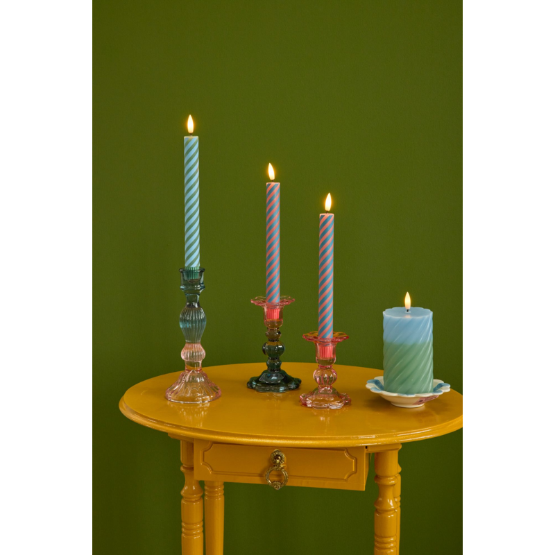 Een glazen kandelaar roze van Rice. Hoogte is 10cm en de diameter is 8cm. Het is een kandelaar voor de standaard maat kaars en geïnspireerd op bloemen.