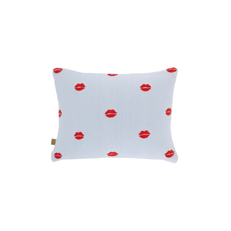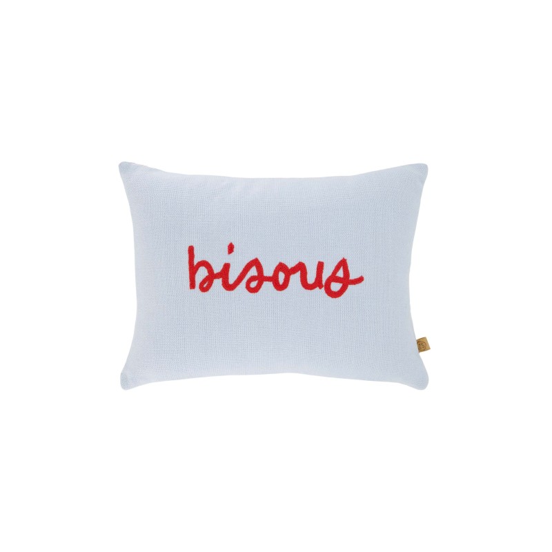 Een leuk kussen van Zusss met op de ene kant de tekst 'Bisous' en aan de andere kant rode kusjes. Het kussen is 25x35cm. Het kussen is gemaakt van 100% katoen. Leuk te combineren met diverse andere prints. Het kussen heeft de kleur blauw/rood.