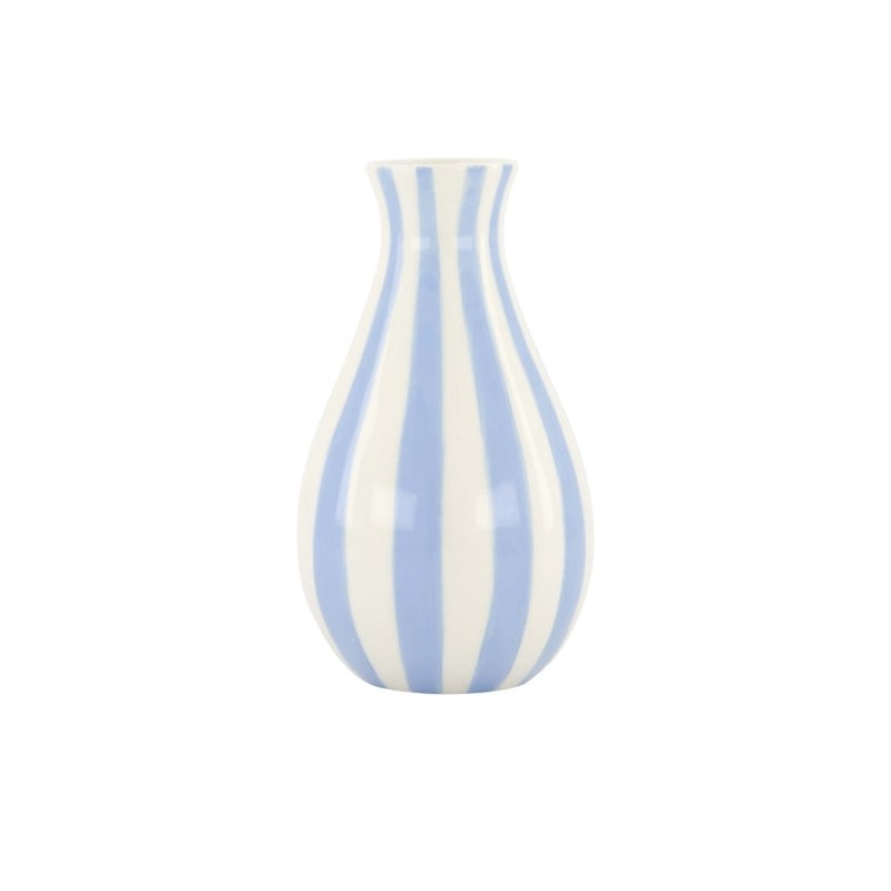 Een vaasje van Zusss, gemaakt van keramiek en handgeschilderd. Het vaasje is wit met blauwe strepen en de afmeting is 7,5x13cm. Leuk voor kleine bloemen.