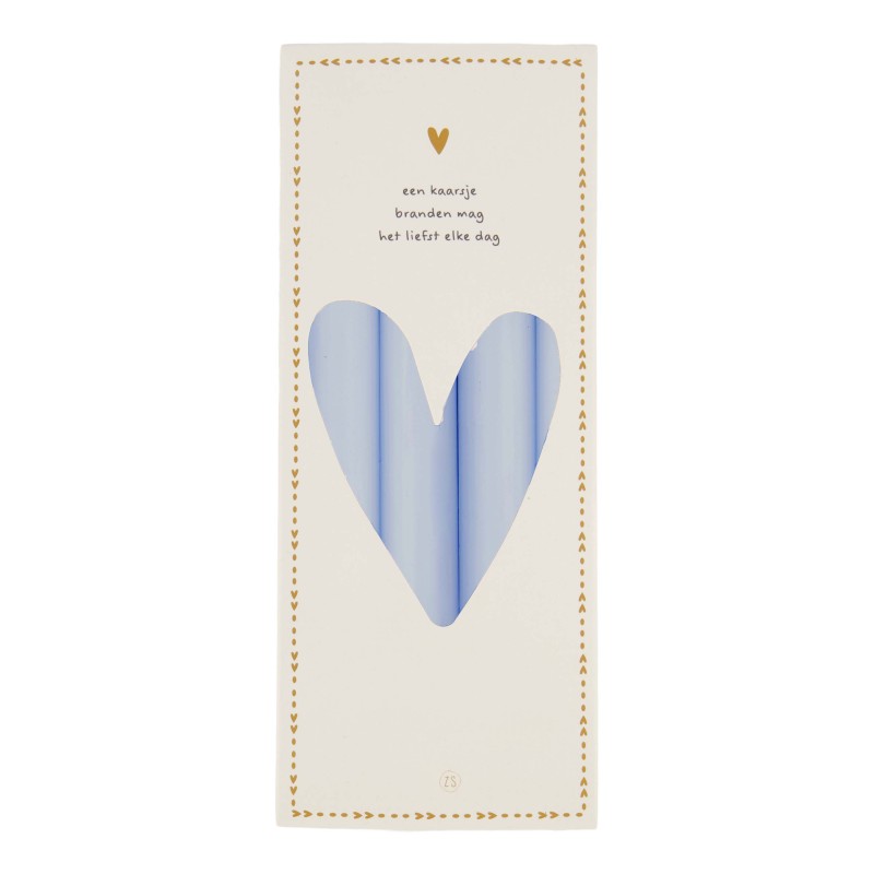 Vier rustieke kaarsen in een leuke cadeauverpakking met een hart in de kleur lichtblauw. De kaarsen zijn 20cm lang en hebben ongeveer 11 branduren.