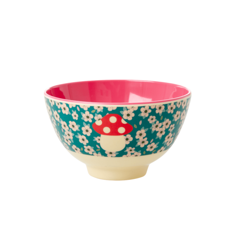Rice Melamine Small Bowl Paddenstoel. Een leuk schaaltje. Afmeting is 6cm hoogte en diameter 11cm. De binnenzijde is knalroze en aan de buitenzijde donkergroen met bloemen en een grote paddenstoel als print.