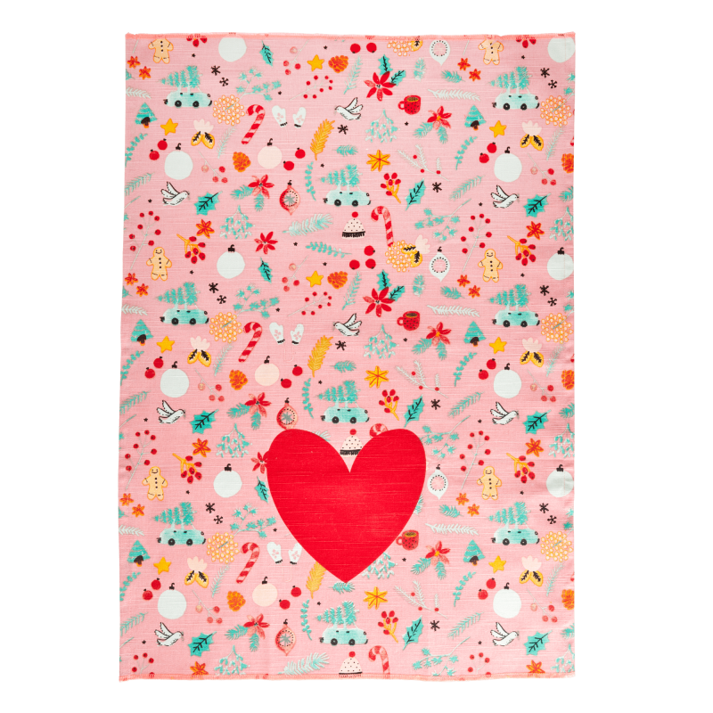 Een leuke katoenen theedoek van Rice. Dit is een print met een groot hart en kerstafbeeldingen. Afmeting van deze theedoek is 70x50cm.