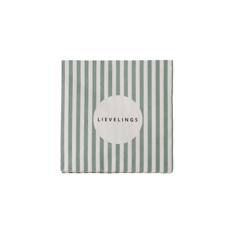 Vierkante servetten van Zusss. Gemaakt van FSC mixpapier. De servetten zijn wit/groen gestreept en de tekst lievelings. Afmeting van de servetten is 12,5x12,5cm. Er zitten 20 stuks in één verpakking.