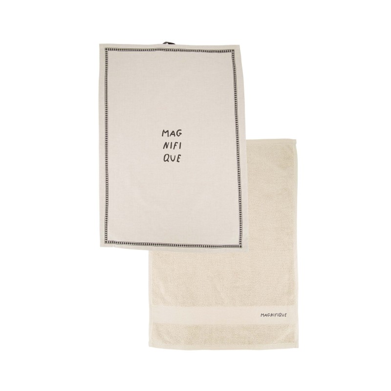 Een keukenset van een handdoek en een theedoek. Een leuk set droogmakers in neutrale beige kleuren. Op beide staat de tekst Magnifique. Beide zijn gemaakt van 100% katoen. Afmeting van beide is 50x70cm.