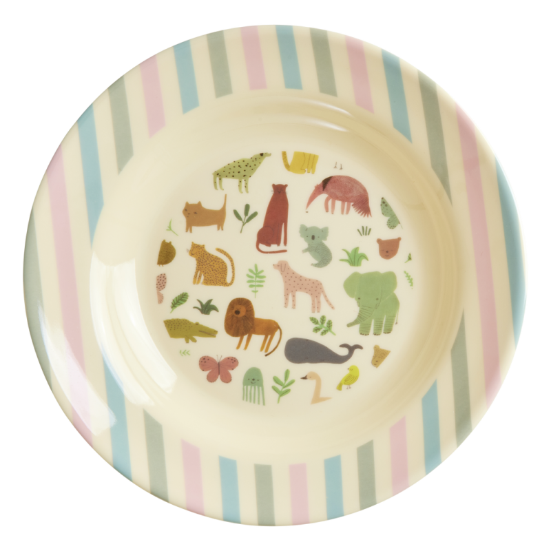 Een rond diep bord van Rice van het Sweet Jungle thema. Het bord heeft een diameter van 20cm en 2cm hoogte. Het bord is gemaakt van melamine en kan in de vaatwasser.