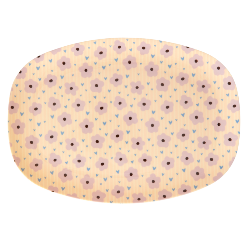 Een ovalen bord van Rice met bloemen (en harten) print. Het bord is 22x30cm en gemaakt van melamine. Het bord kan in de vaatwasser. Het bord is leuk te combineren met de andere producten in dezelfde print.